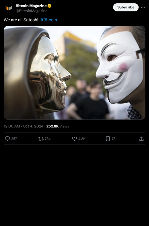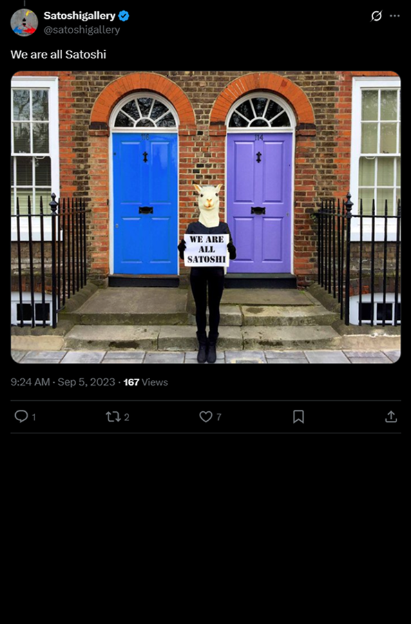 A symbol of the origin of crypto’s ethos, the roots of decentralization, the spirit of anonymity, and the unifying belief that We are all Satoshi.